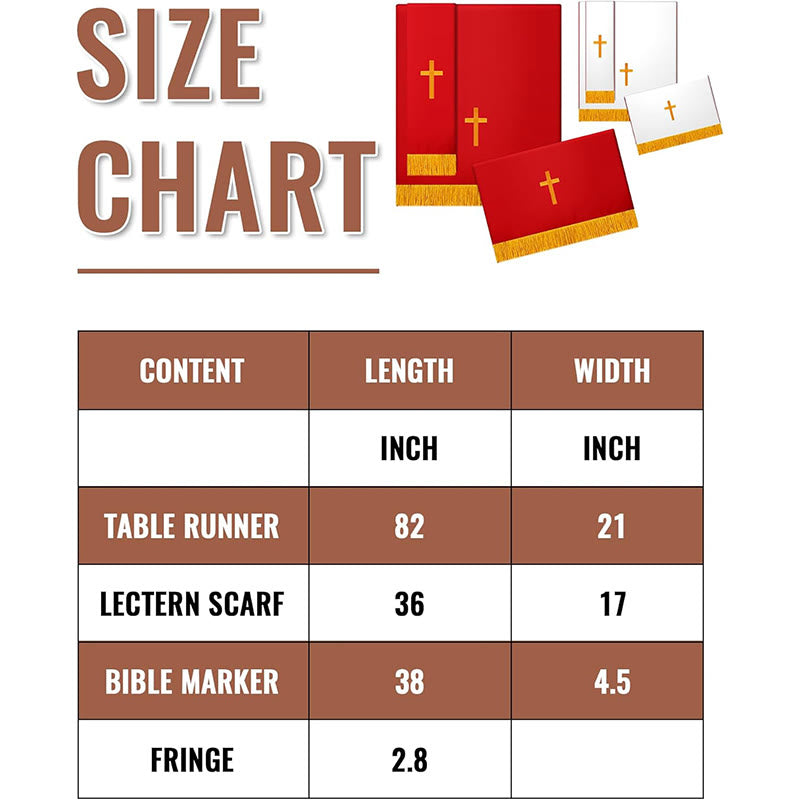 Table Runner:82''*21''/208*53cmLectern Scarf:36''*17''/91*43cmBible Marker:38''*4.5''/96*11cm - Care Instruction:Machine Wash
