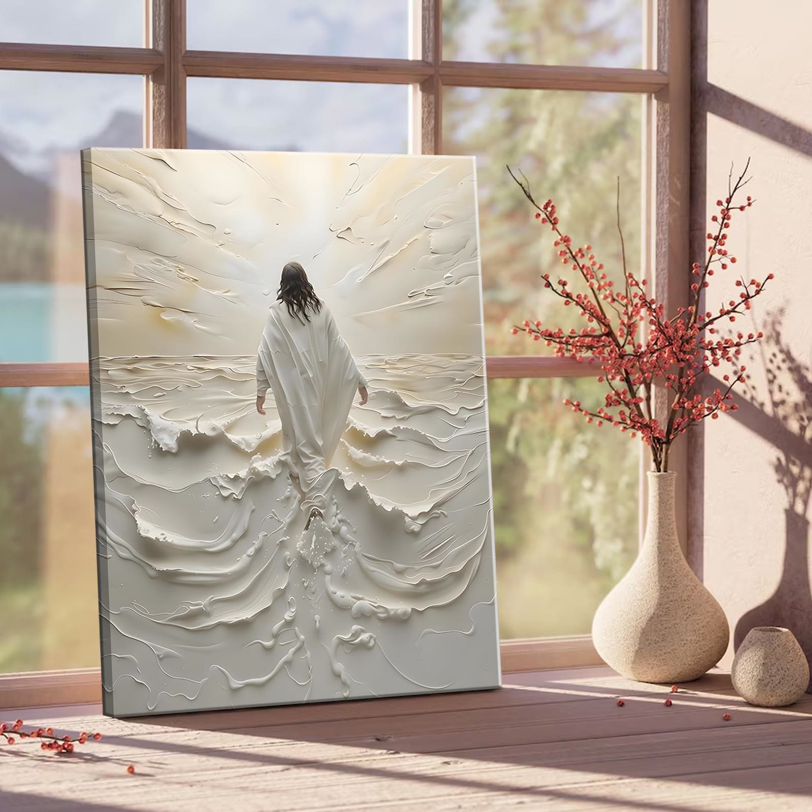 Featuring Jesus walking on water with textured, ethereal detailing, this art print radiates spiritual faith and divine guidance — inviting reflection on Christ’s miraculous presence. -