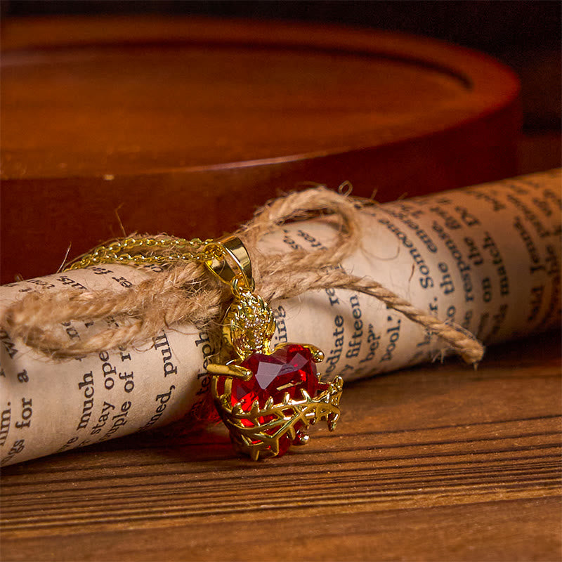 The necklace features a beautifully detailed sacred heart, wrapped in a crown of thorns and aflame, representing Christ’s eternal love and passionate devotion to humanity. The vibrant red heart crystal gleams with life, while the gold elements add a touch of divine elegance, making it a powerful statement of faith. -