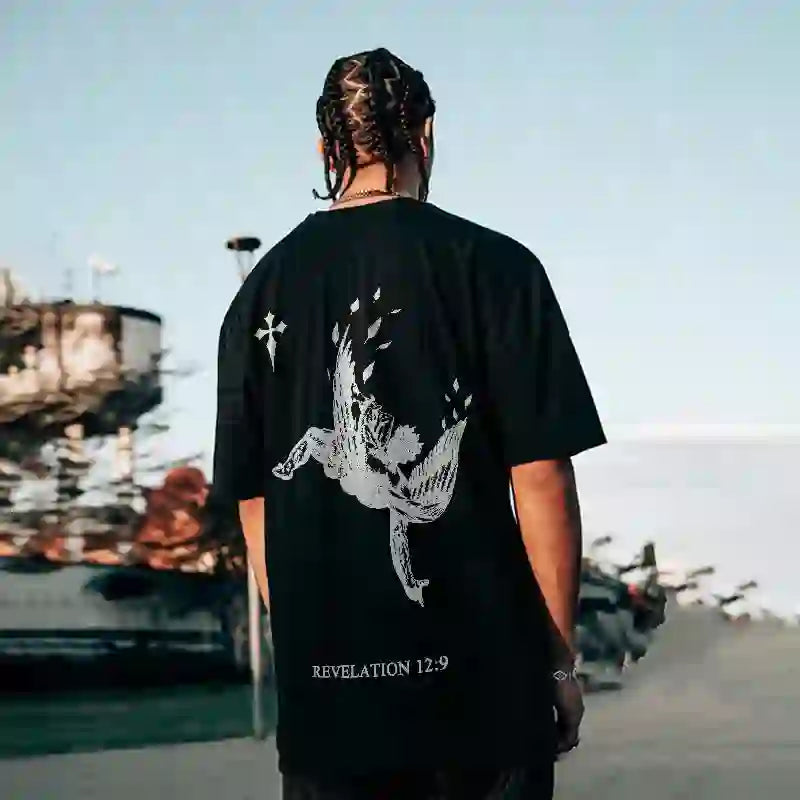 The back design of this T-shirt is unique. The white pattern looks like a winged image, and some of the wings are broken, conveying a sense of struggle or confrontation. The simple cross element on the side strengthens the religious atmosphere. The "REVELATION 12:9" marked below gives the pattern a deeper religious meaning. The Book of Revelation is a book in the Bible full of prophecies and symbols. The images related to this chapter are often associated with themes such as the struggle between good and evil and divine revelation, which triggers the wearer and the viewer to think about religious doctrines.