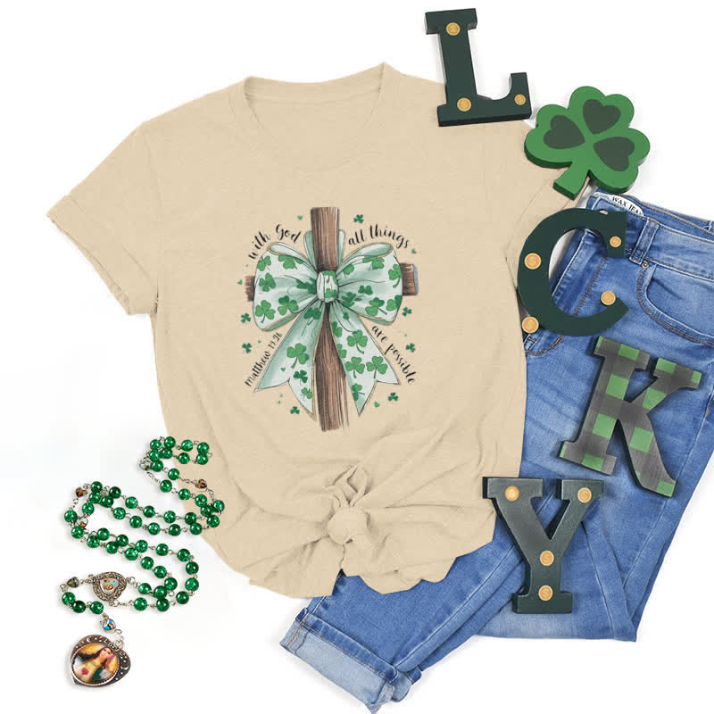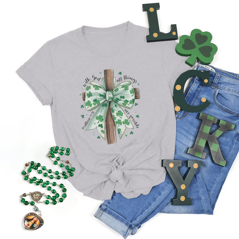 Celebrate the magic of St. Patrick's Day with our enchanting "With God, All Things Are Possible" T-shirt. This piece beautifully intertwines the essence of the holiday with a profound message of faith and hope. Featuring a delicate cross adorned with a shamrock-patterned bow, it pays homage to the rich heritage of St. Patrick’s Day—symbolizing luck, faith, and blessings. The inspiring verse from Matthew 19:26 serves as a gentle reminder that with God's grace, every possibility is within reach. Wear this shirt as a token of divine blessings and let it fill your day with the true spirit of St. Patrick’s Day—joy, faith, and a touch of magic.