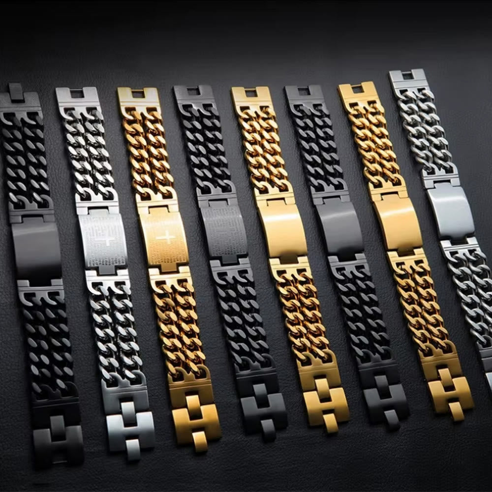 Featuring a detailed plaque with The Lord’s Prayer and cross, this bracelet blends robust style and spiritual significance — inviting reflection on faith and personal commitment in daily life. -