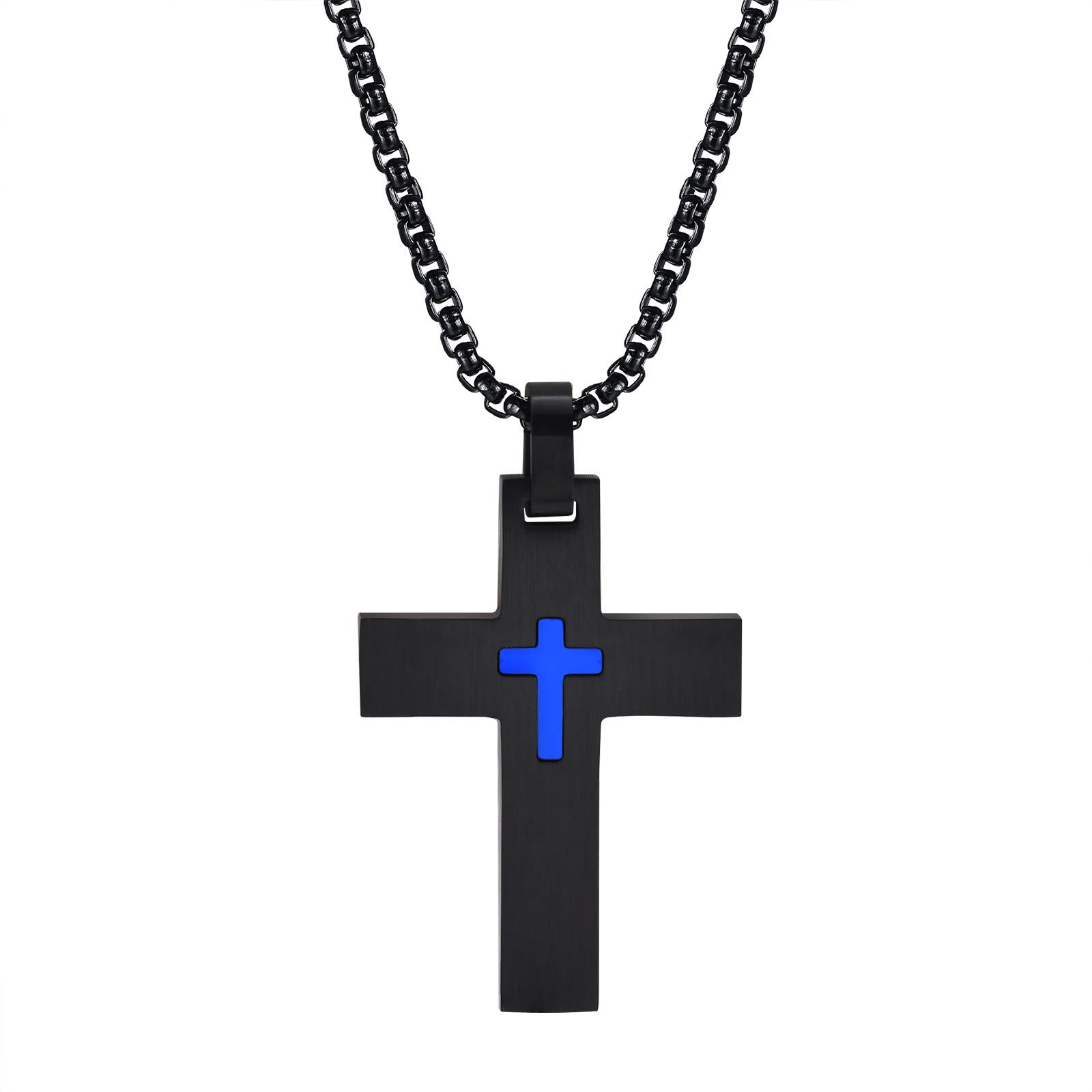 oThe polished stainless steel finishes — in black paired with golden or blue — give the cross a sharp, modern allure, while the classic cross shape carries the age - old message of spiritual devotion and redemption.