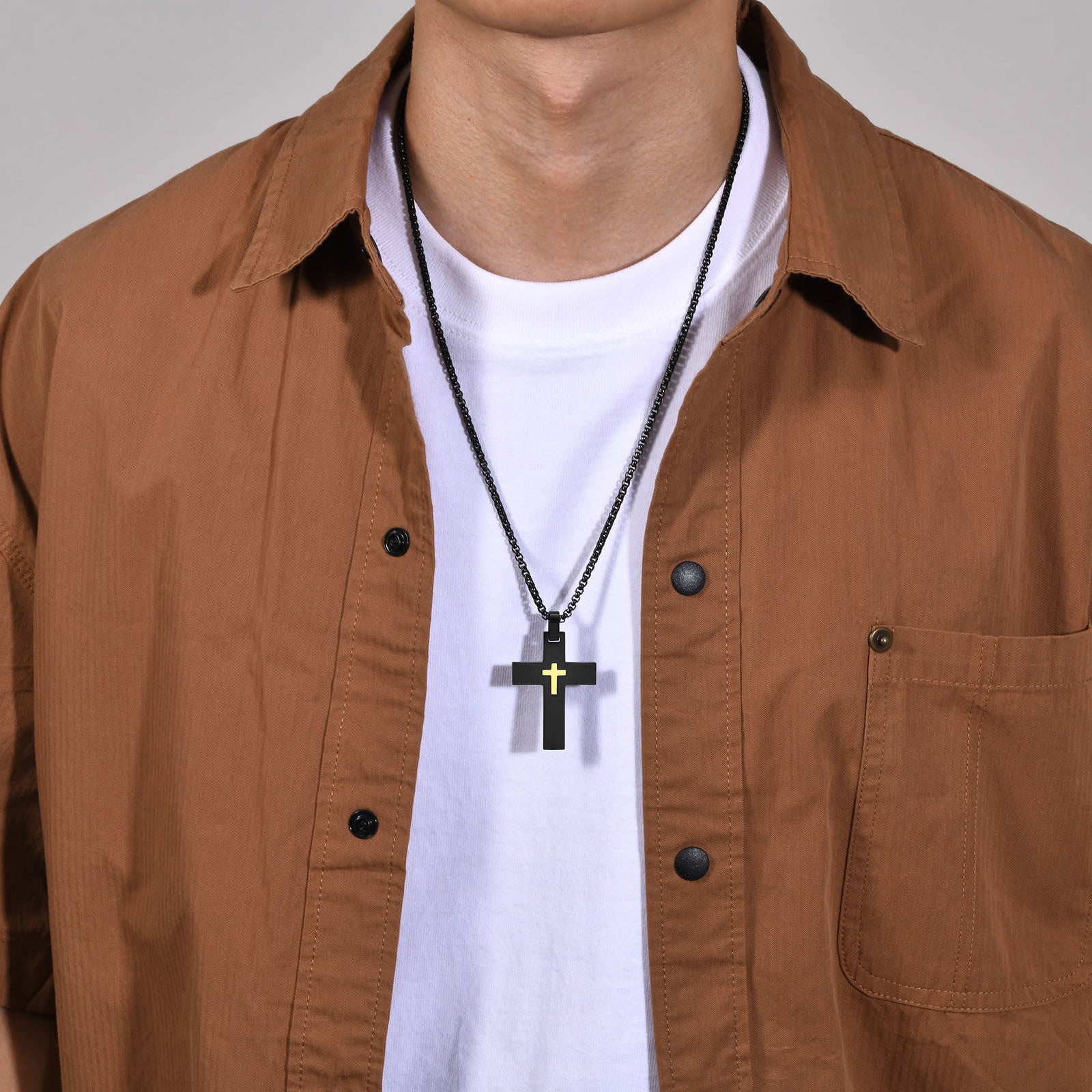 As you wear this necklace, the cool touch of stainless steel with dual hues (golden-black or blue - black) against your skin becomes a reminder of faith’s presence in everyday life.