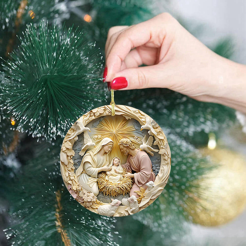 - Nativity Holy Family Star & Doves Hanging Ornament: Celebrate the birth of Christ with this devotion-filled ornament featuring the Holy Family beneath the radiant Bethlehem Star. Framed by a wreath of florals with gentle doves and lambs, its soft ivory, gold, and sky-blue tones create a warm Christmas focal point for windows, trees, entryways, or a prayer corner.