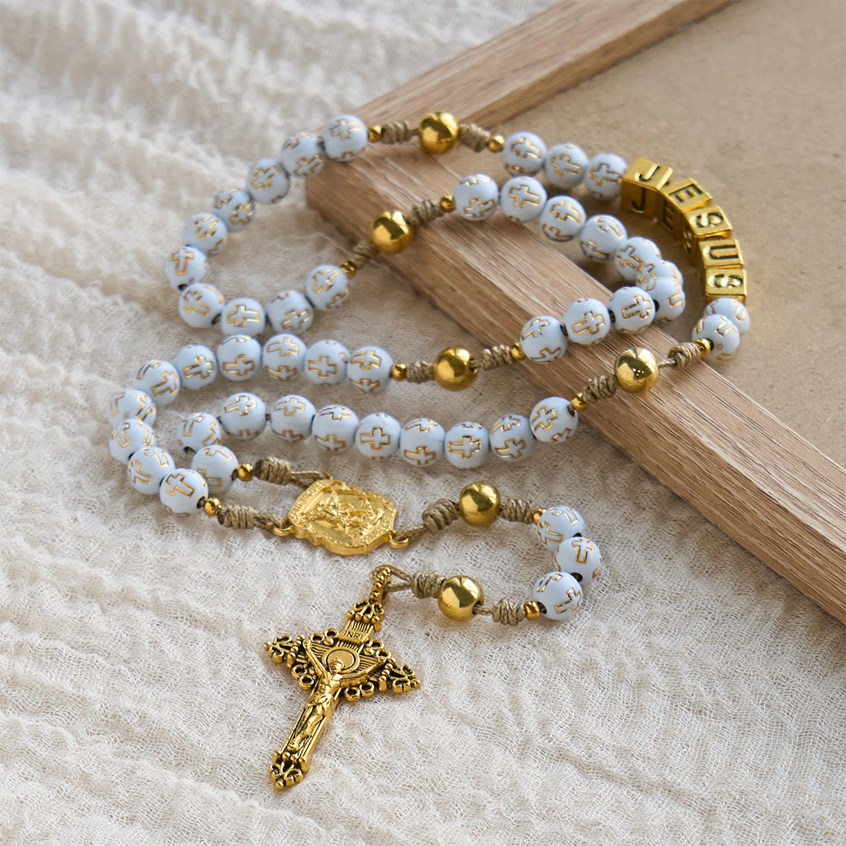 Combining timeless religious symbols (the crucifix, “JESUS” lettering) with ivory beads, it serves as a cherished prayer tool and a meaningful gift for those who cherish both faith.
