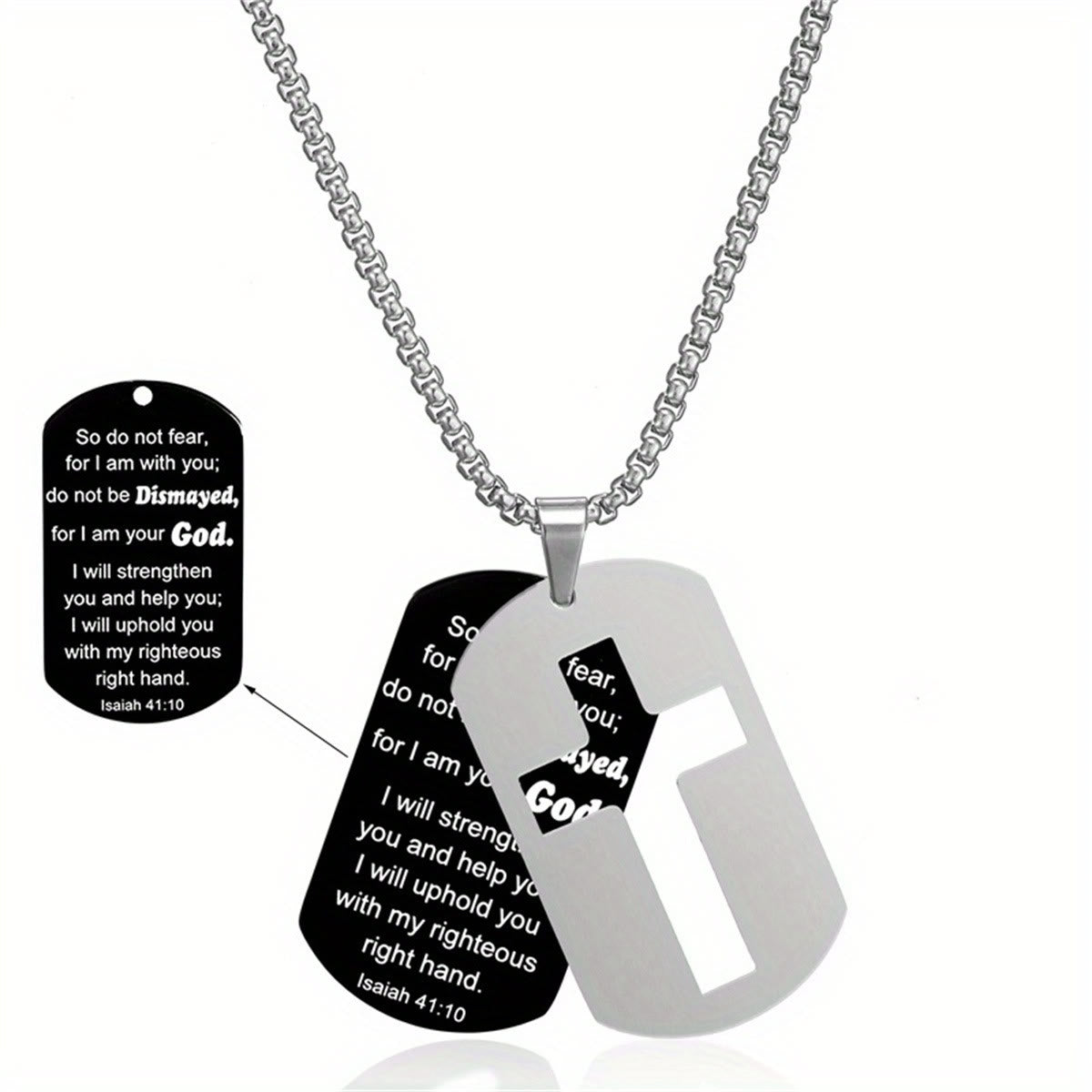 This verse series necklace merges dual dog tags (e.g one with an cutout cross, one engraved with Isaiah 41:10) and a polished chain — pairing bold design with the quiet promise of His strength to create a steady daily companion. -