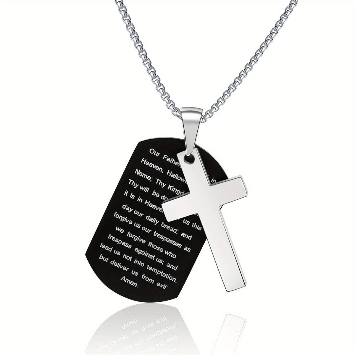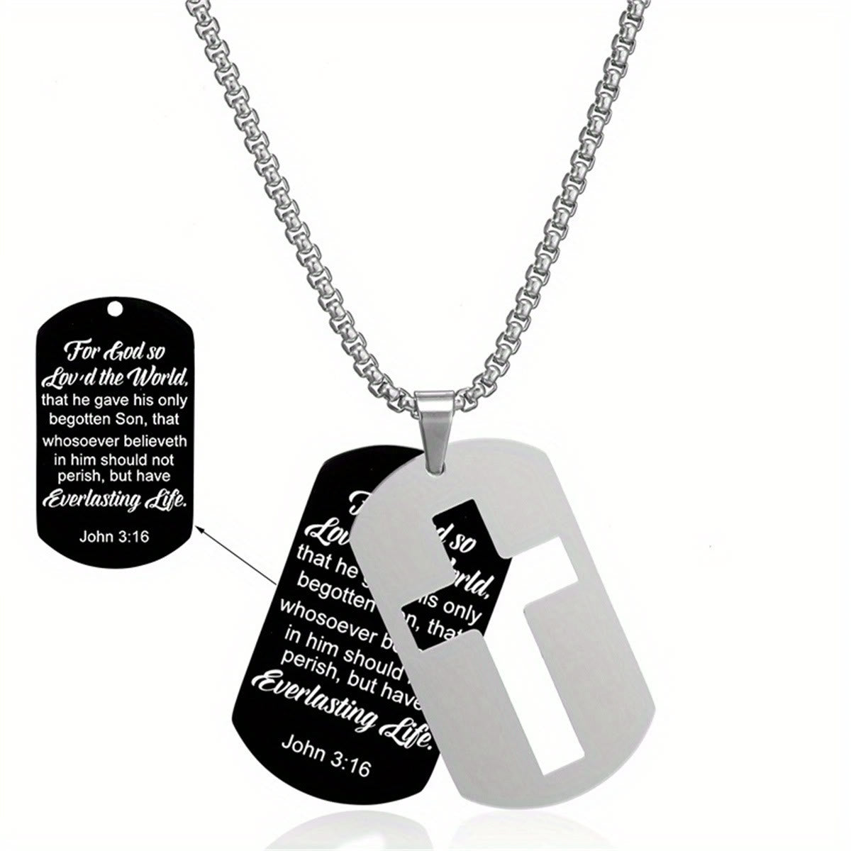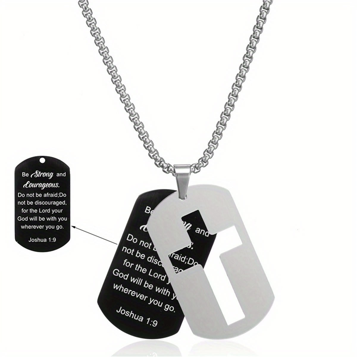 Meticulously made with durable metal and clear engravings, it balances sleek texture with the grace of the cross and His word. The dual-tag style adds depth, turning it into a firm reminder of His care. -