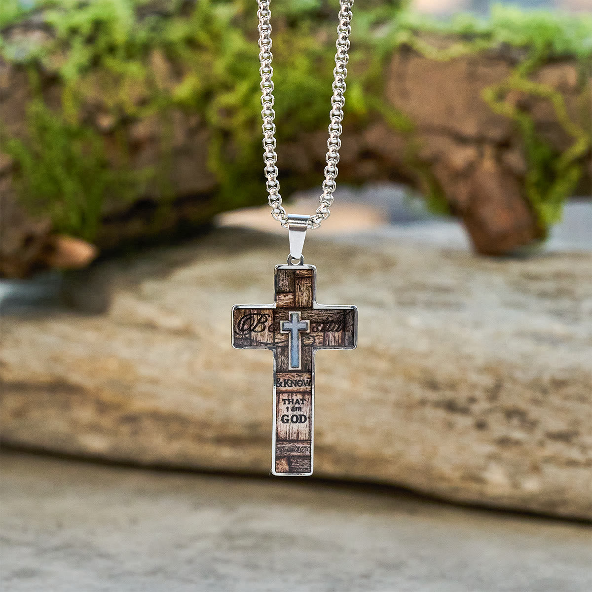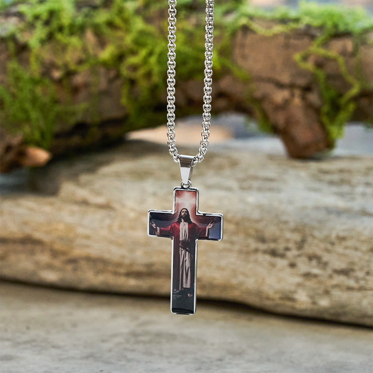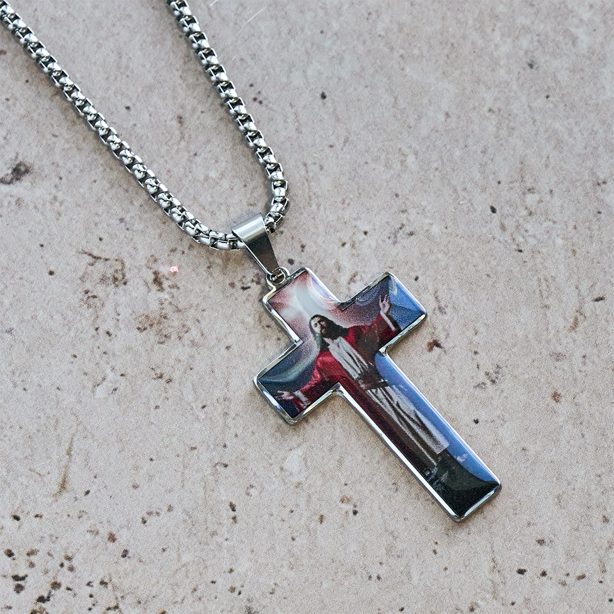 Inside the pendant you’ll find devotional visuals and a small inset cross motif that echo themes of redemption, grace, and prayer. The artwork is sealed beneath a glossy finish for lasting clarity and wear resistance. -