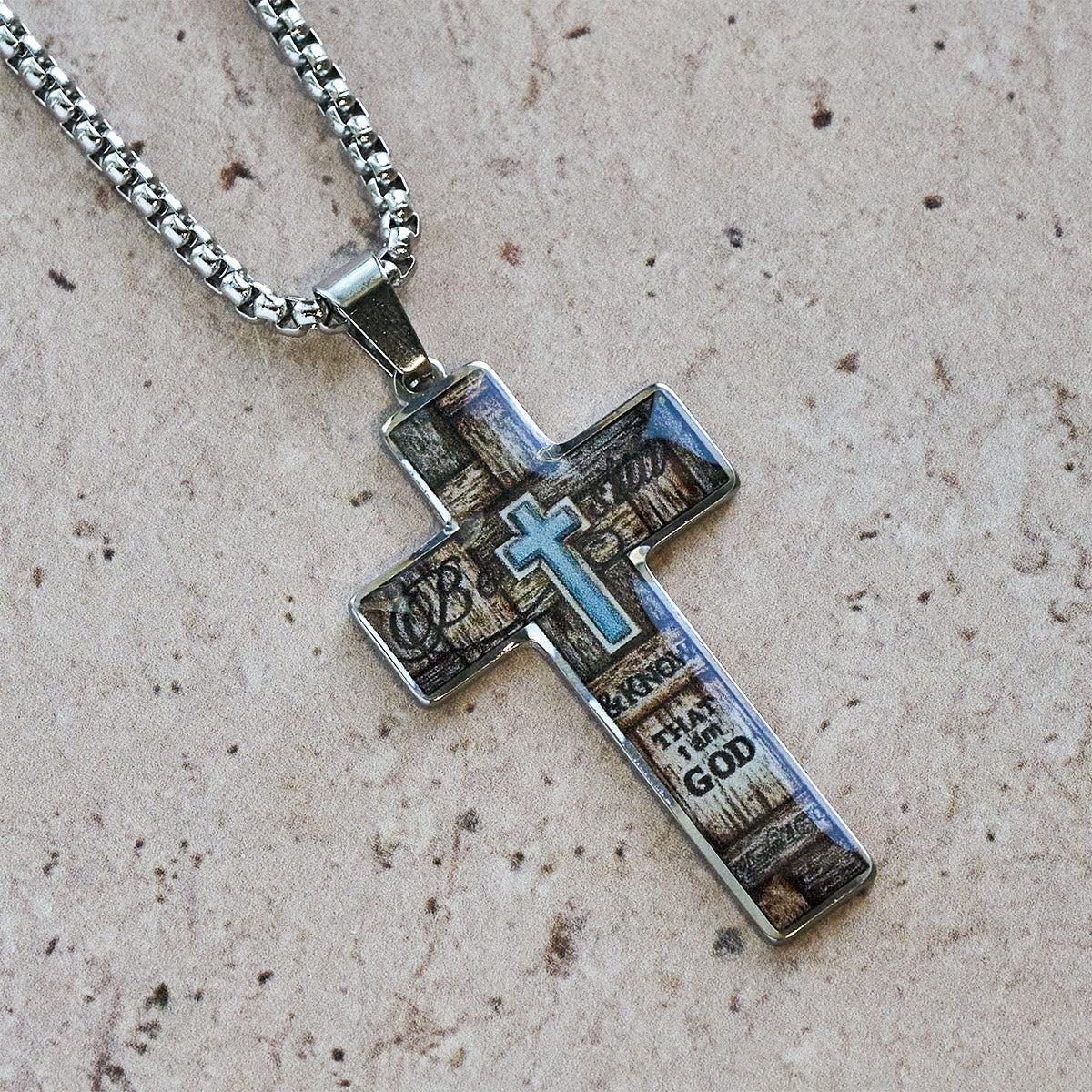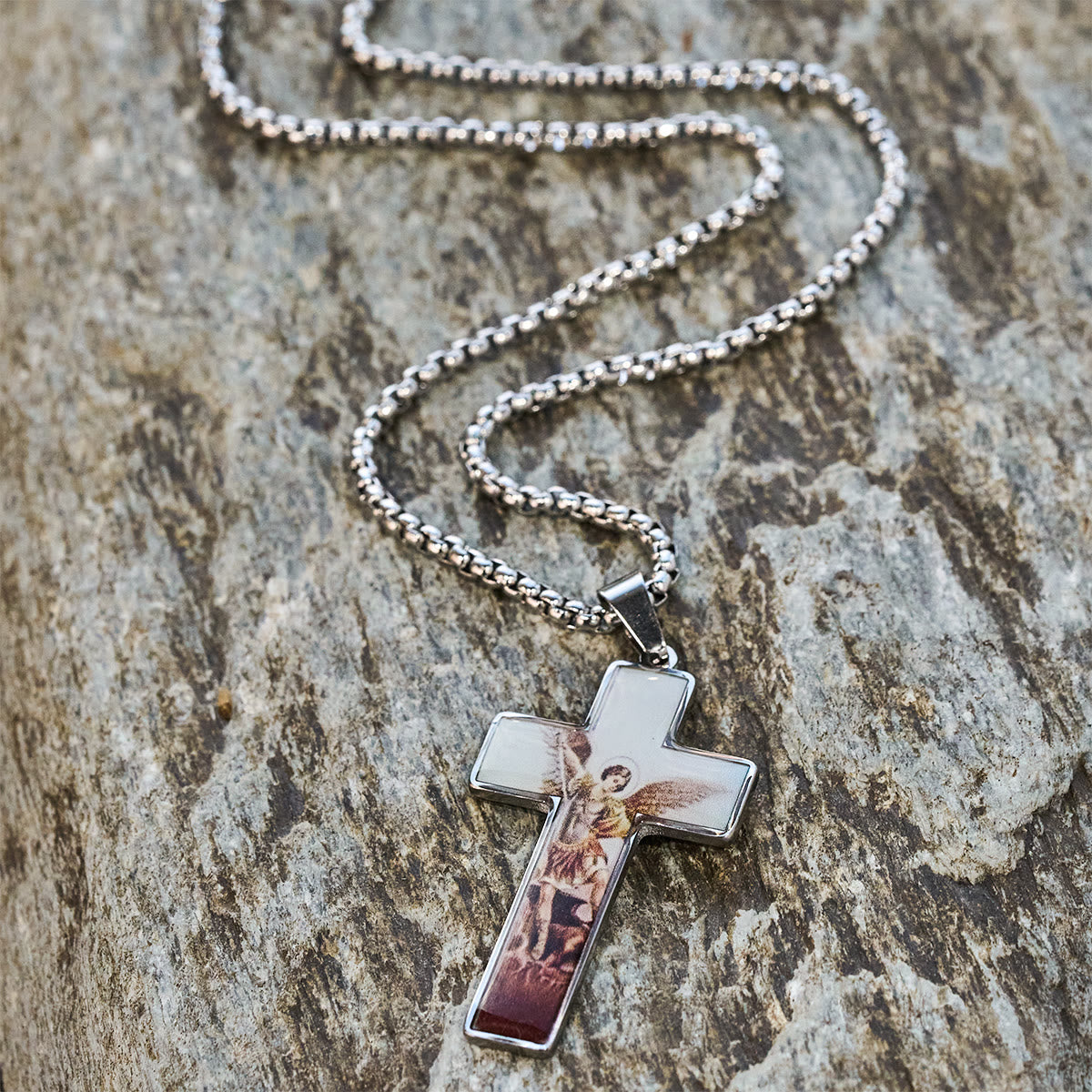This cross pendant pairs a polished metal frame with finely printed sacred imagery — faces of the Savior, St. Michael figure, and rustic wood-texture cross motifs — all set within a classic Latin cross silhouette. The sturdy boxed chain and gleaming bail give it a refined, everyday-ready look. -