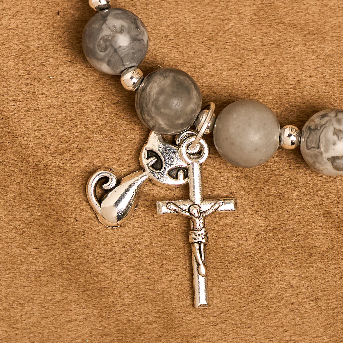 This prayer bracelet strings soft light-grey beads with twin tabby-cat charms and a tiny crucifix—calm, timeless, and made to keep love for pets and strays close at hand. -