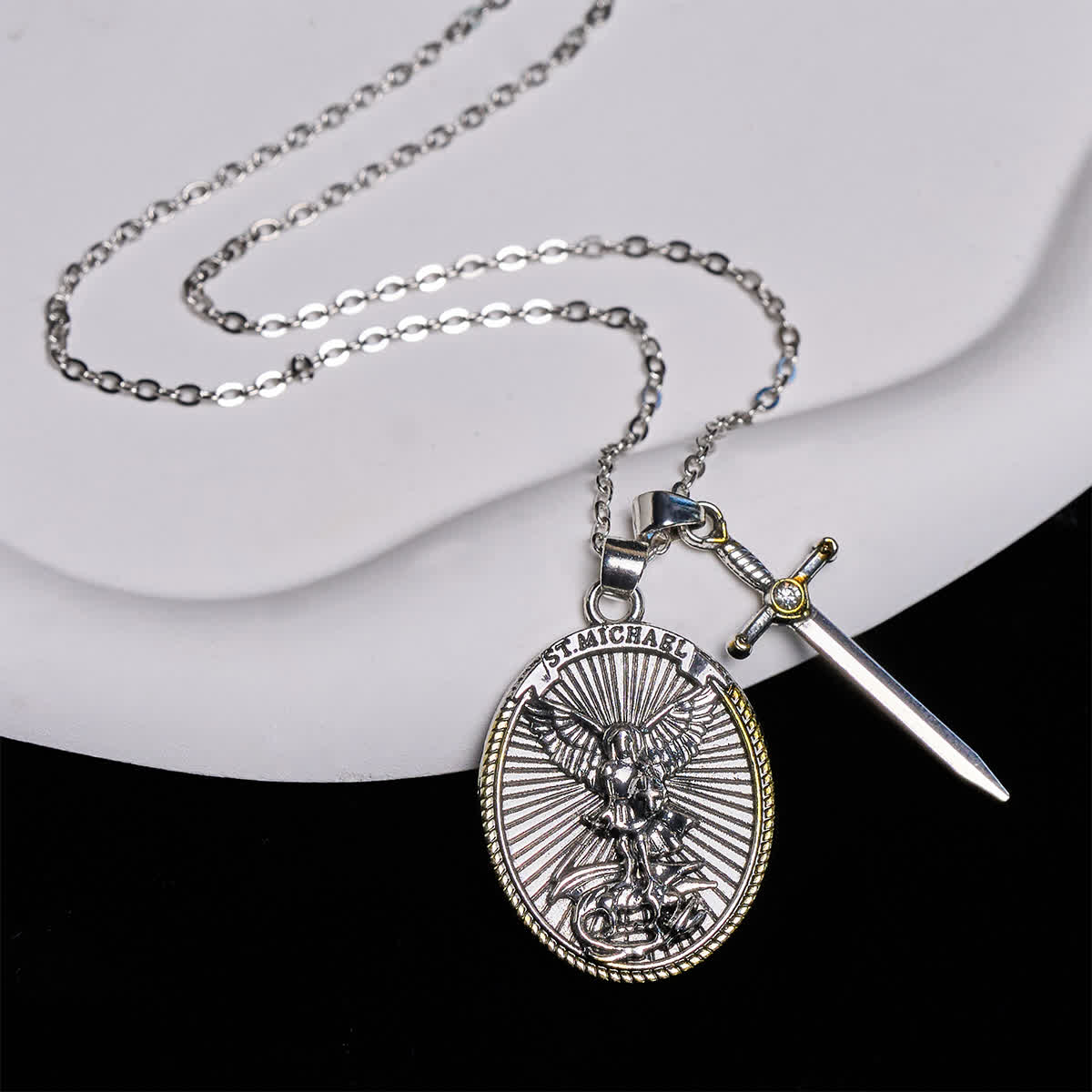 Crafted with polished silver - tone metal and golden accents, this necklace centers on the timeless symbolism of St. Michael. The intricate oval pendant features St. Michael vanquishing the dragon, paired with the “ST. MICHAEL” inscription, while the accompanying sword - shaped charm with a cross and crystal serves as a powerful emblem of protection and spiritual courage, honoring the strength of faith. -
