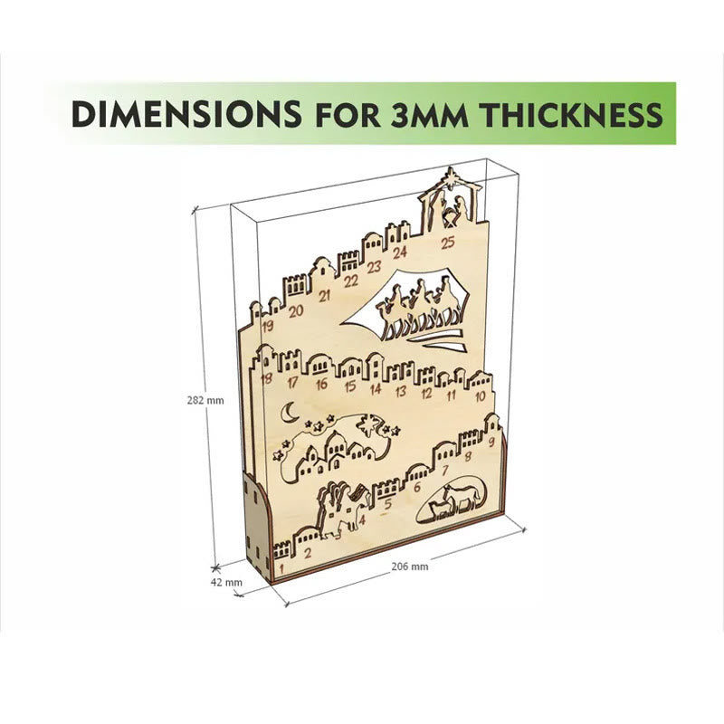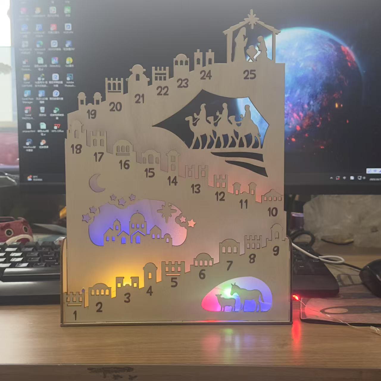 Meticulously crafted from wood, the calendar showcases detailed nativity scenes, numbered days, and symbolic elements, creating a devotional countdown to Christmas. -