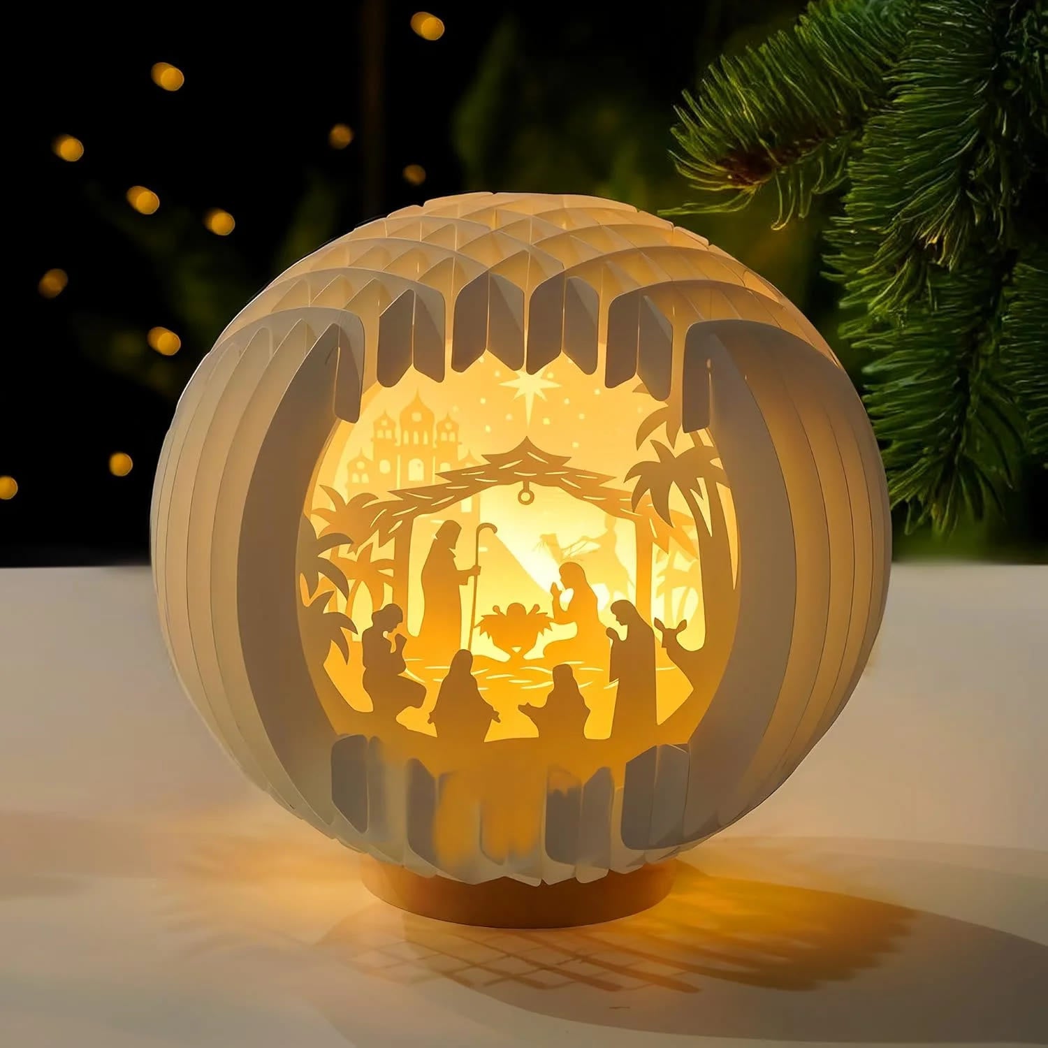 Meticulously crafted, the lamp showcases detailed nativity cutouts, a glowing interior, and a spherical form, creating a devotional ambiance for Christmas. -