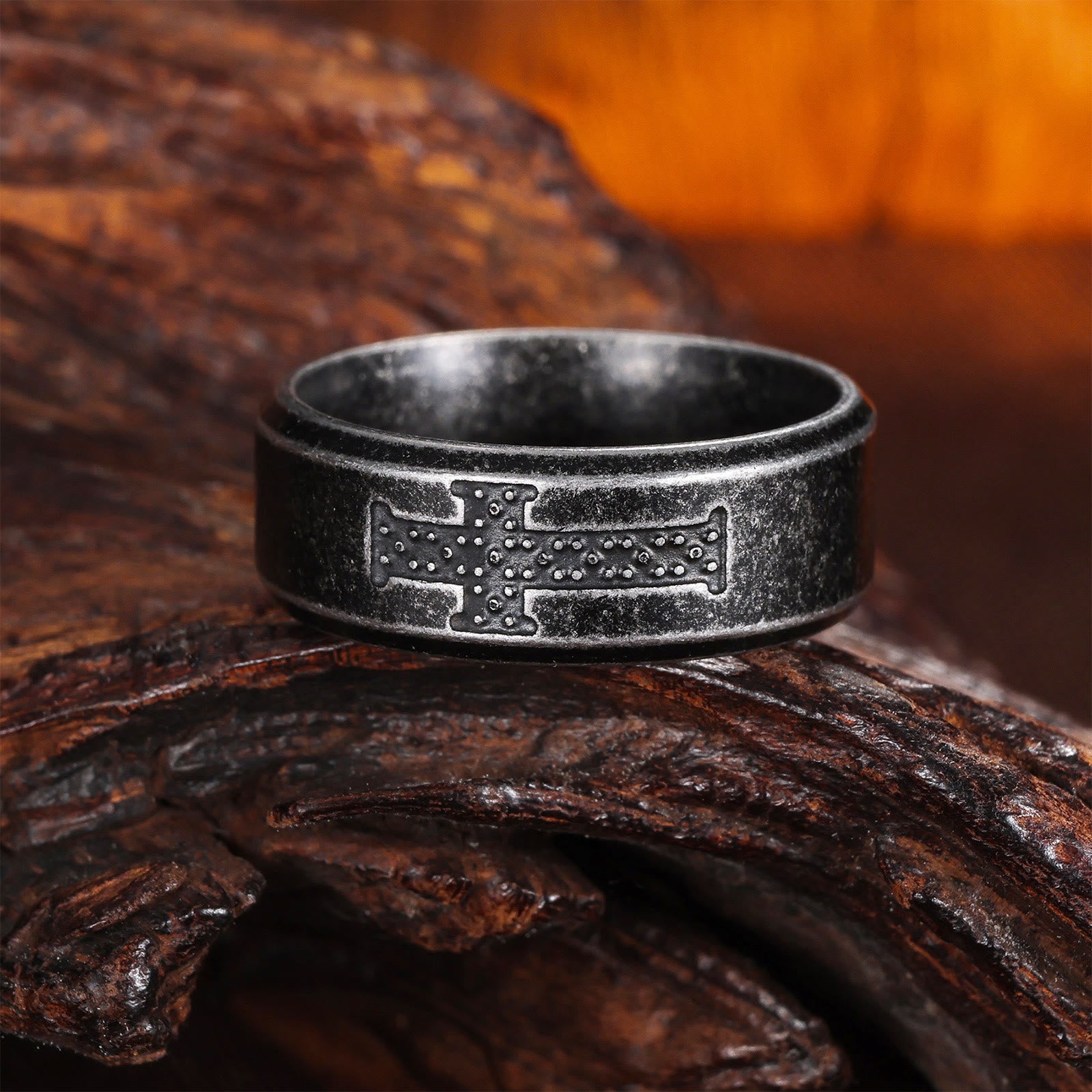 The band features an embossed cross, accented with tiny dots, set in a weathered, polished finish. Each piece balances understated artistry with reverence, honoring the cross’s symbolism through sturdy, intentional craftsmanship. -