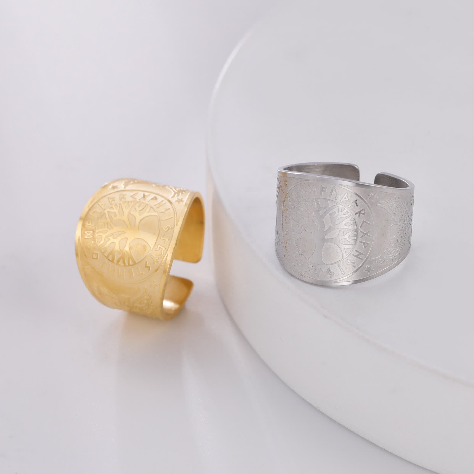 A wide, adjustable band features an intricate engraving of the Tree of Life, surrounded by subtle script detailing. Available in polished gold and silver finishes, this lightweight ring anchors faith in a visible reminder of spiritual growth and being rooted in His love. -
