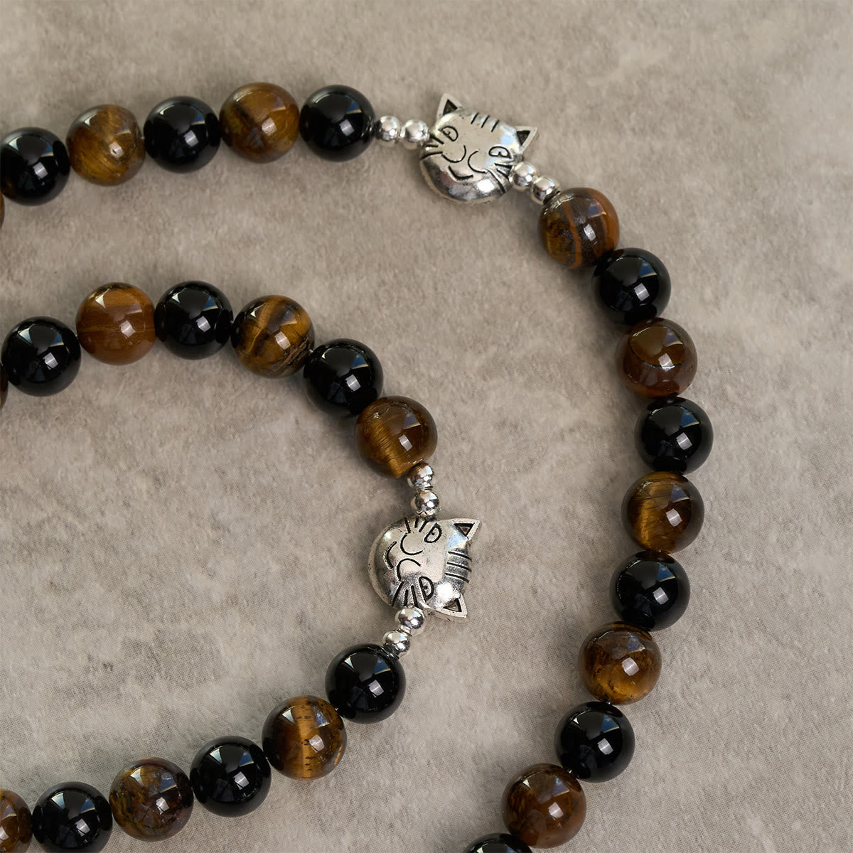 This rosary combines deep brown and black beads with stainless steel cat-face charms, reflecting the tabby cat’s natural stripes. A prayer tool that unites faith and creation, it embodies both devotion and compassion. -