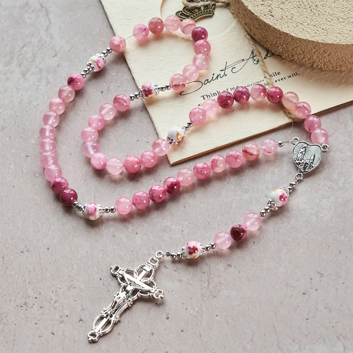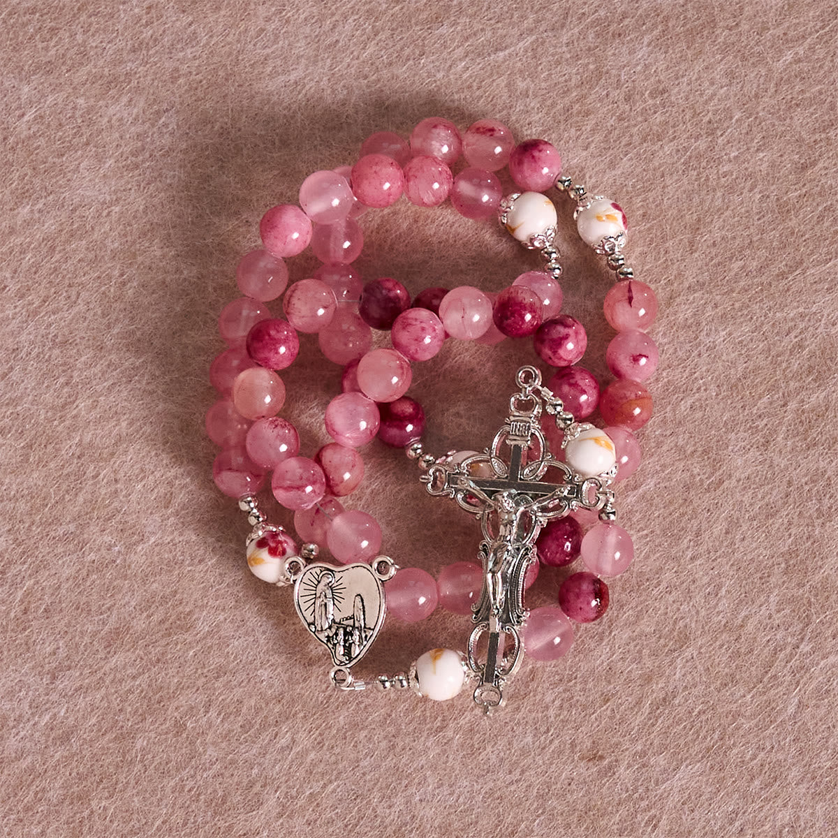 The pink jade beads, like a stream of tender devotion, flow toward the silver crucifix, anchoring each prayer in the depth of faith. It blends jade’s grace with sacred meaning, celebrating spiritual connection’s beauty. -