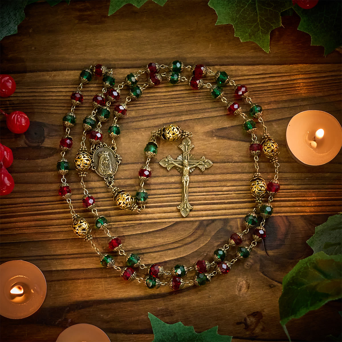 Adorned with radiant red and green beads, this rosary captures the spirit of Christmas, blending festive joy with sacred devotion. Each bead reflects the warmth of the season and the eternal promise of Christ’s love. -