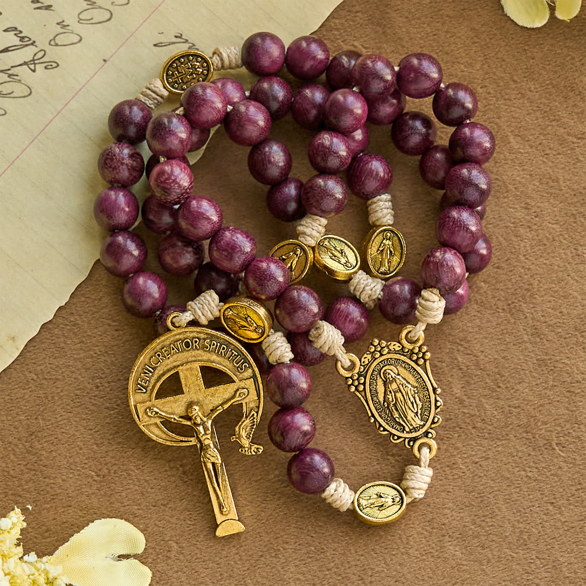 Knotted sections set a steady rhythm as purple recalls repentance, contemplation, and royal dignity, while gold speaks of glory and joy. Multiple Miraculous Medals and the Marian centerpiece invite Our Lady’s tender intercession; the haloed crucifix proclaims salvation encircled by Christ’s light. -