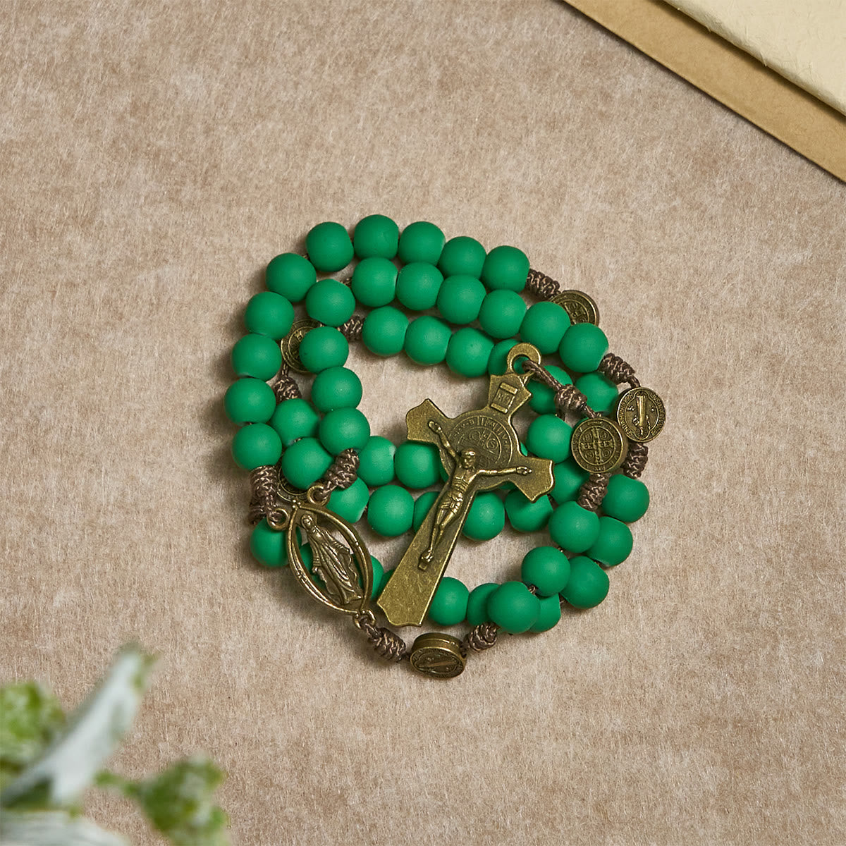 This rosary unites serenity and strength through a design that embodies both protection and devotion. Crafted with matte green rubber beads, antique bronze accents, and multiple St. Benedict medals, it serves as a shield of faith — a companion for those who seek peace, courage, and divine guidance in daily prayer.