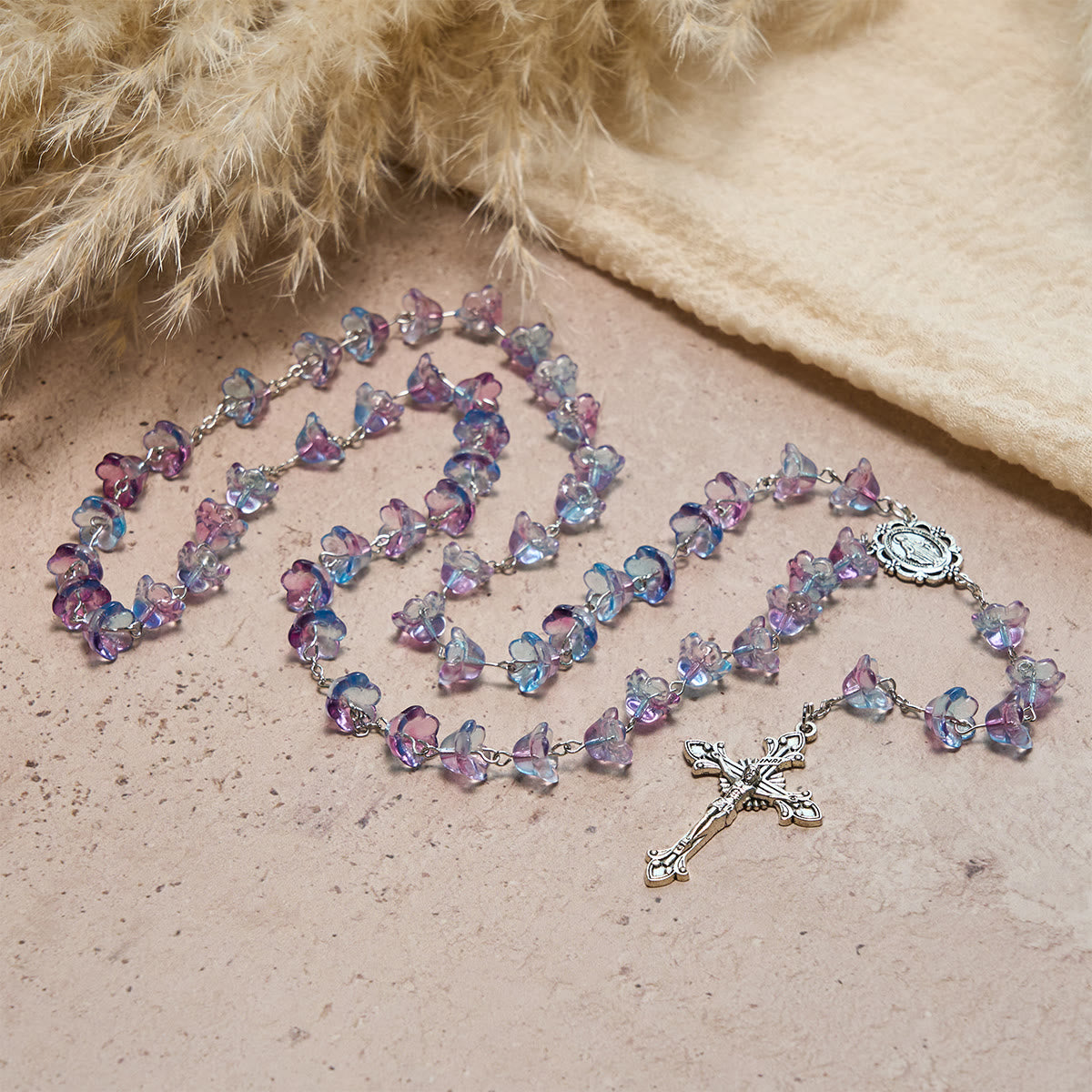 This rosary drapes in translucent lily-of-the-valley blossoms—misty blue and soft violet like dew at dawn. A vintage Our Lady centerpiece and an elegant crucifix gather the decades into a gentle hymn of praise. -