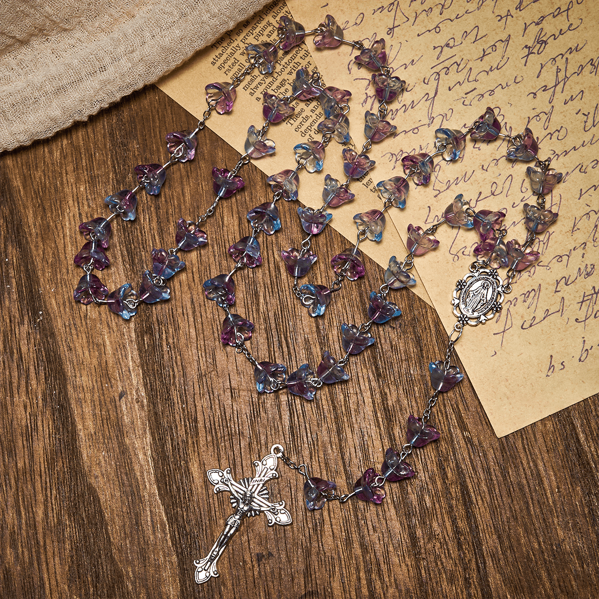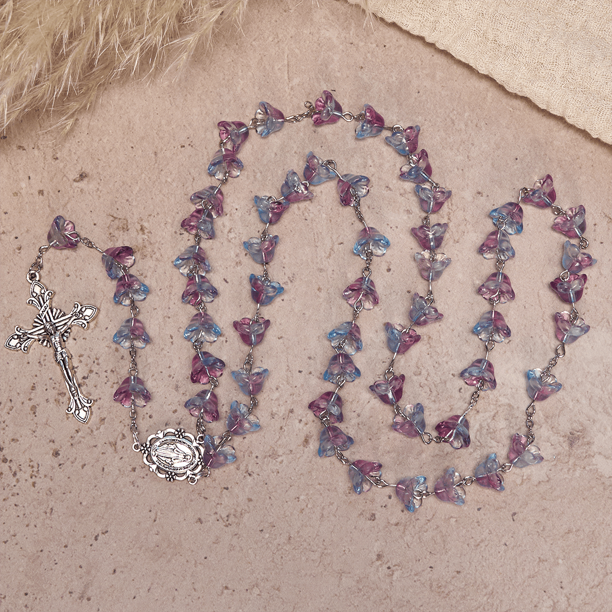 Hand-linked floral beads create a light, flowing cadence; the Miraculous Medal invites Mary’s loving intercession, while the finely detailed crucifix proclaims Christ’s saving love and the path of discipleship. -