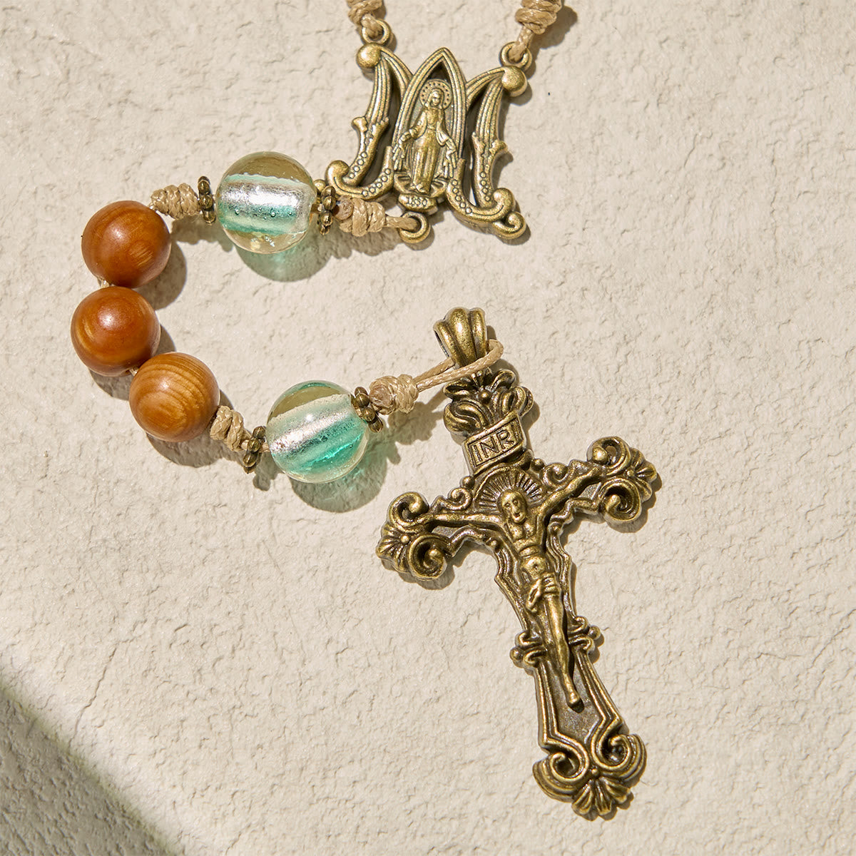 The soft brown wooden beads paired with bright green accents create a calming rhythm for your fingers during meditation. This harmonious design encourages a deep connection to your faith.