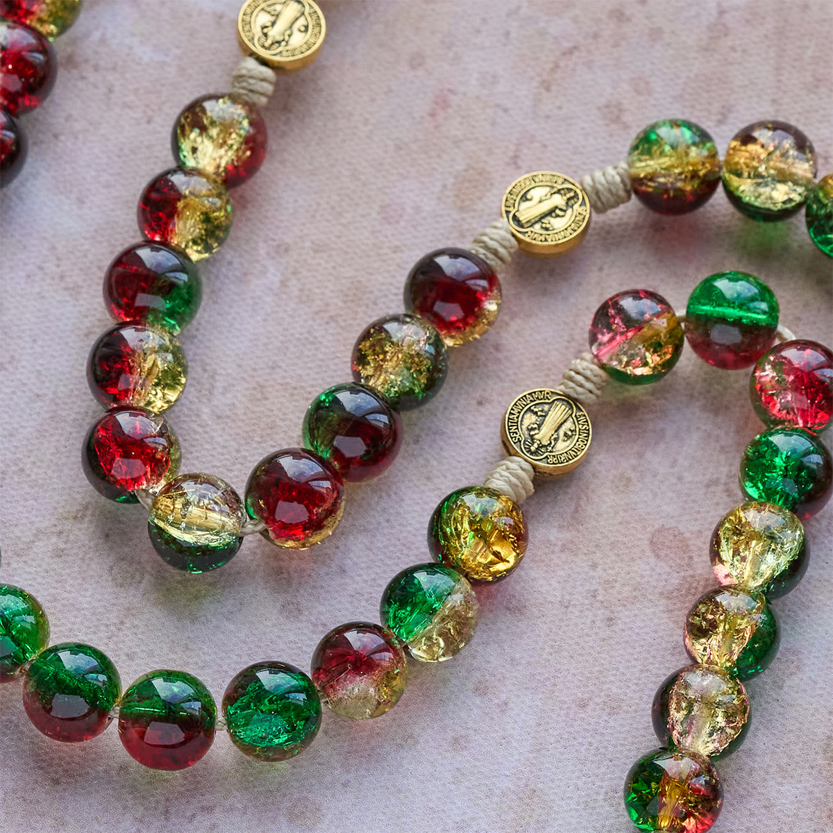 This rosary is a vivid testament to faith — a strand of prayer beads that draws the heart near to God. Every glass bead glows with spiritual rhythm, urging the soul to abide in love, trust, and divine grace. -