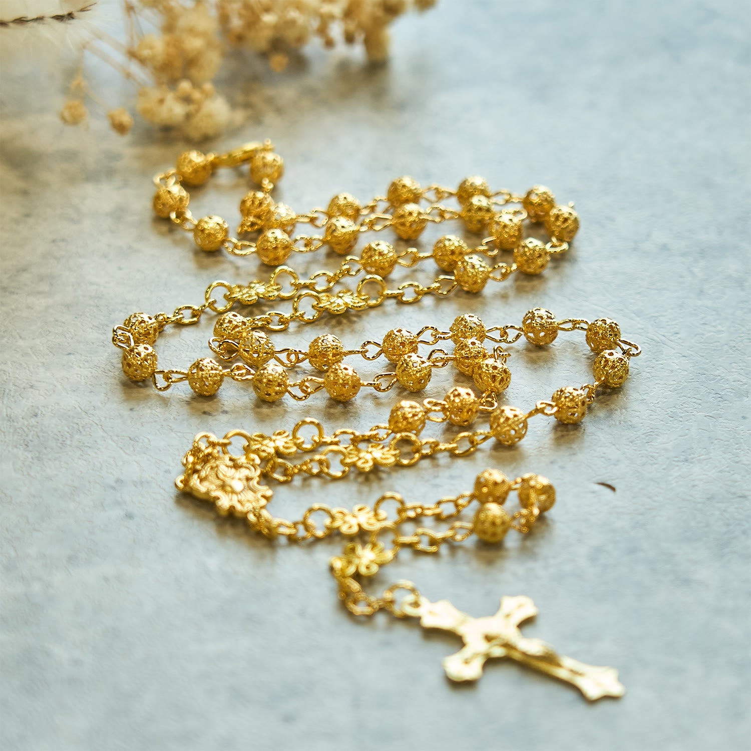 The golden metal beads symbolize God's glory. The crucifix represents Jesus' sacrifice, central to our faith. The detailed centerpiece invokes saints' intercession and divine blessings.