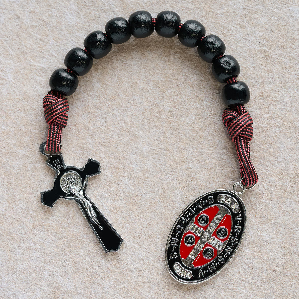 This single-decade paracord rosary unites black wooden beads, red-black cord, and dual St. Benedict emblems in a compact form—crafted for believers who carry faith as armor. Bold, portable, and purposeful, it embodies the prayer of warriors who trust in the Lord’s protection through every trial.