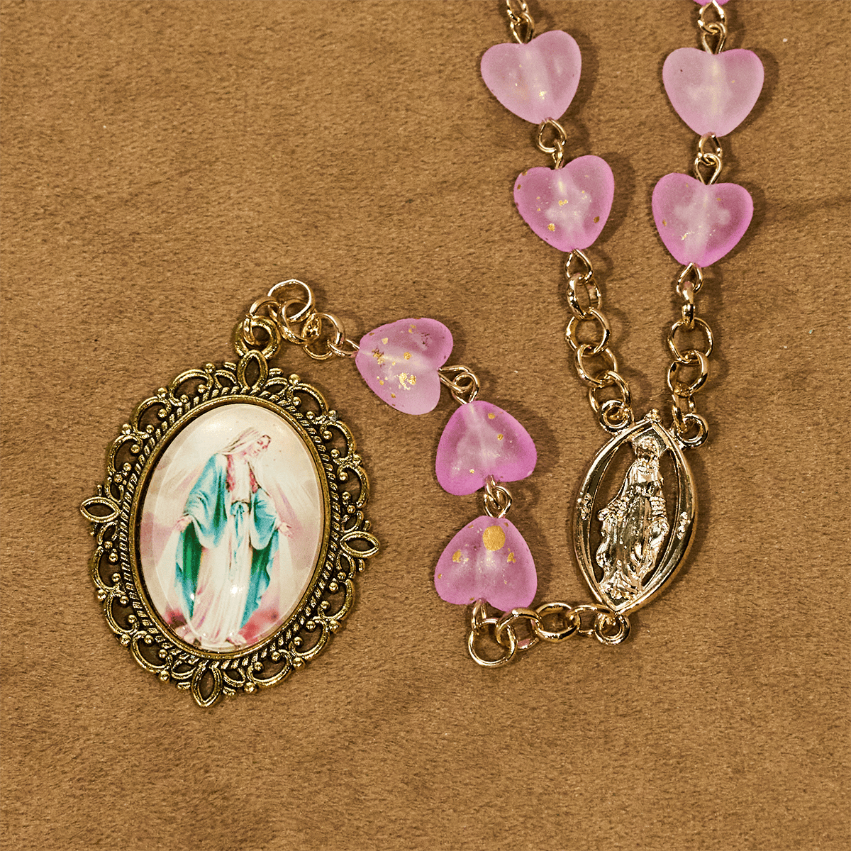 This rosary and bracelet set merges faith symbolism with delicate design. The heart-shaped beads, butterfly accents, and Our Lady of Guadalupe center blend spiritual depth and artistic charm, making prayer a heartfelt union of devotion and beauty. -